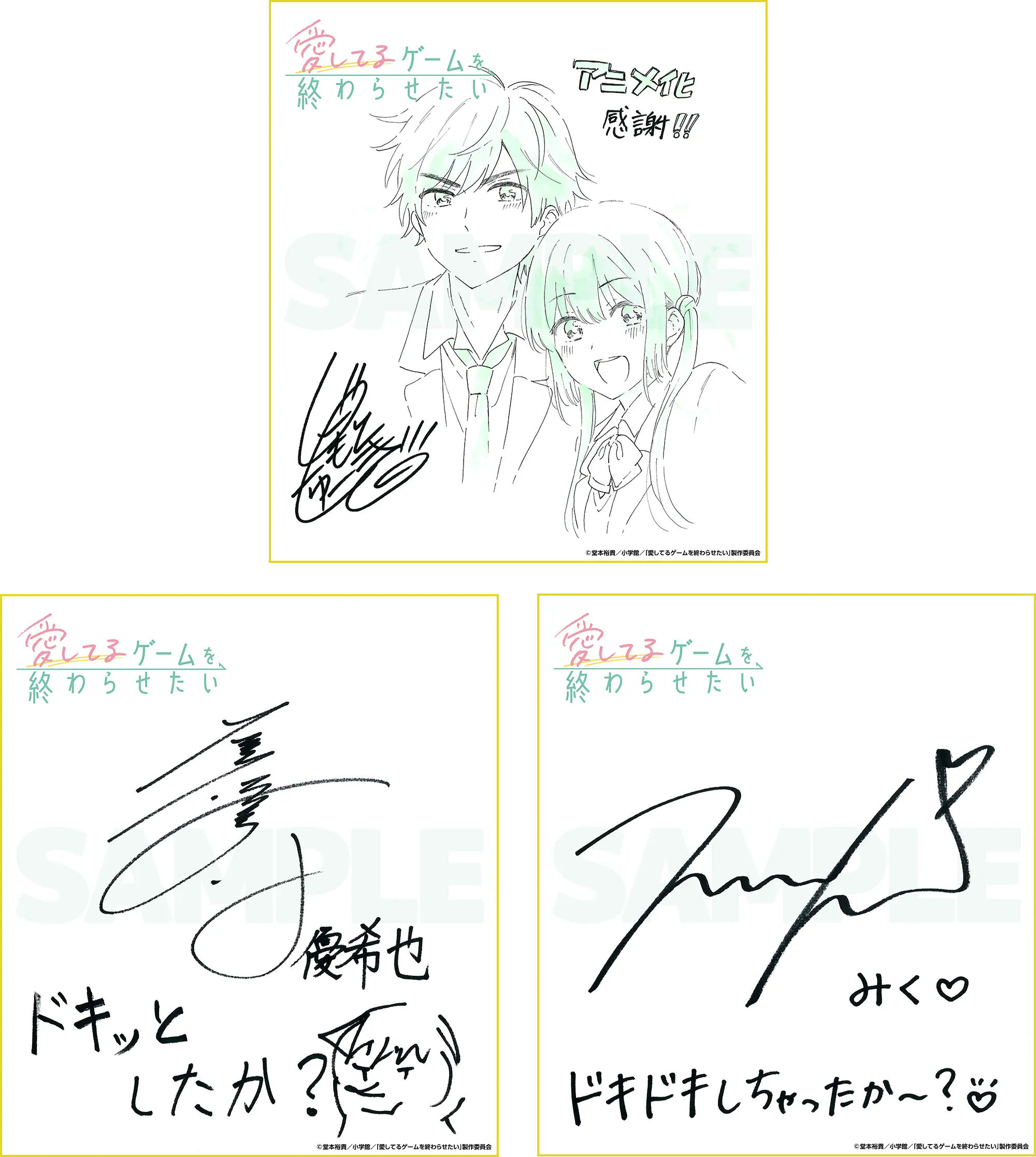 堂本裕貴先生によるお祝いイラスト色紙と、メインキャスト2名のサイン色紙のプレゼントキャンペーンの実施が決定! 「愛してるゲームを終わらせたい」公式Xアカウントをフォロー&対象のキャンペーン投稿をリポストしていただいた方の中から抽選でそれぞれ1名様にプレゼントいたします。奮ってご応募ください!